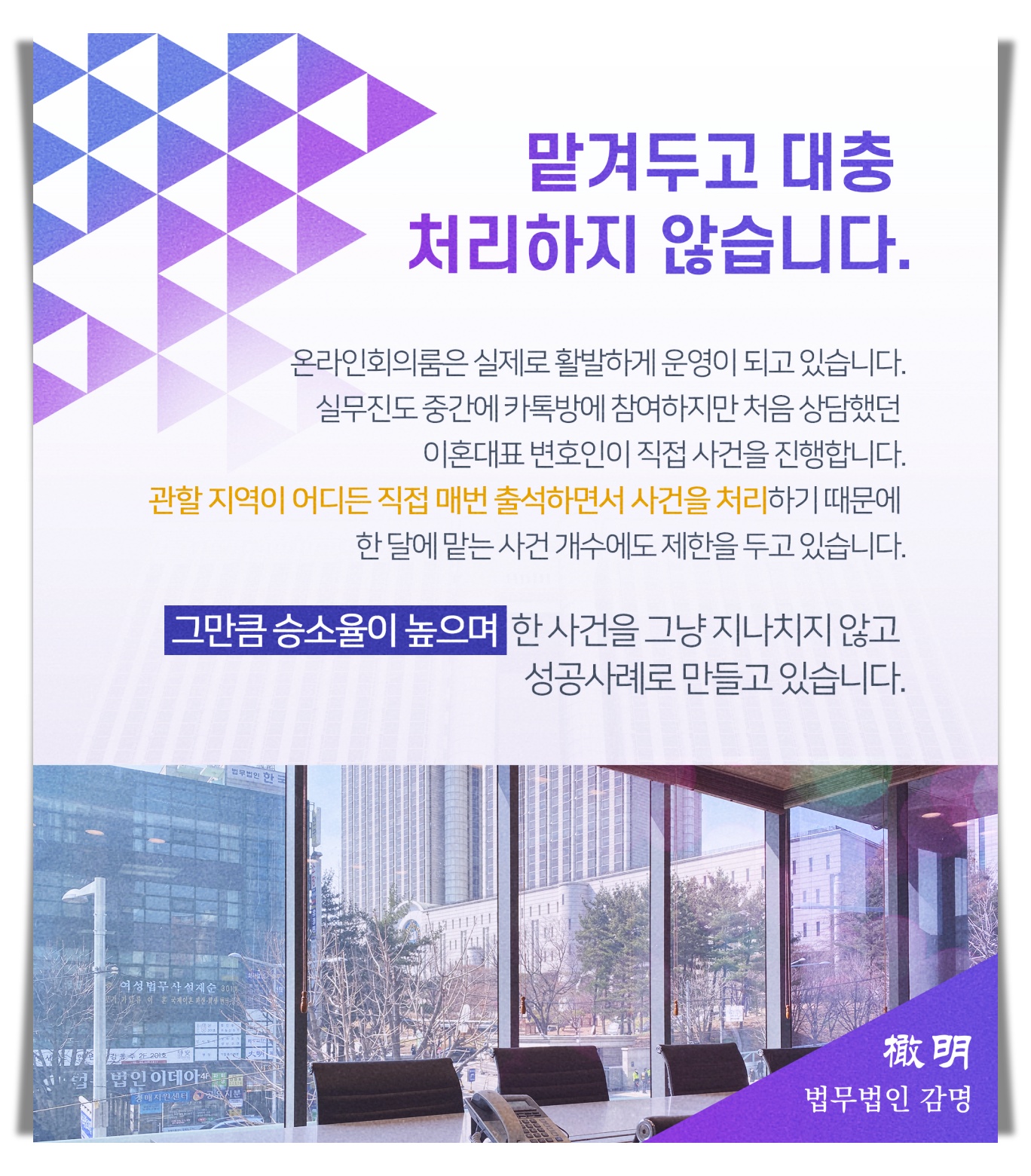 이혼·가사전문변호사를 중심으로 결성된 법무법인감명의 이혼 전담센터입니다. 24시간 전화상담가능